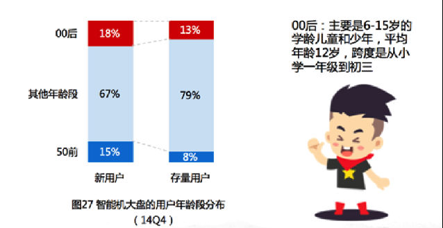 數(shù)據(jù)顯示,2014年下半年智能手機出貨量之中,新用戶購機占比僅為31%(13年下半年為48%),越來越多的手機被售出的原因是用戶要更換新機。在新增用戶之中,00后和50前占比正在快速上升。00后指的是2000年之后出生的用戶,實際上主要是6-15歲,小學(xué)一年級到初三的學(xué)生;50前則是年齡已超過55歲的老人??梢娨苿踊ヂ?lián)網(wǎng)正在向“兩端拓展”。