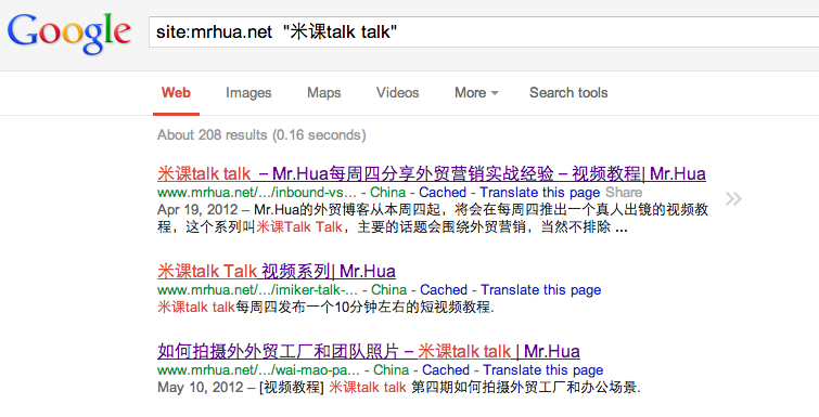 我們知道在谷歌adwords里有精準匹配和廣泛匹配和否定關鍵詞,那么在搜索中用的指令其實也有類似的功能。 我們可以用site: 和keyword直接匹配尋找網(wǎng)站中頁面包含某關鍵詞的,用起來也很簡單。這樣對于一些沒有附帶搜索框功能的網(wǎng)站,我們可以很容易找到我們需要的信息,很方便。通過這個指令你可以搜索出mrhua博客中所有米課talk talk公開課的視頻課程。