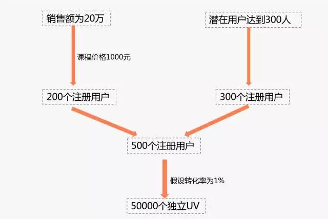 比如總目標(biāo):5月份銷售額為20萬,潛在用戶達(dá)到300人。根據(jù)公式:銷售額=UV*客單價*轉(zhuǎn)化率??蛦蝺r是確定的,課程售價1000元,轉(zhuǎn)化率根據(jù)網(wǎng)站平均轉(zhuǎn)化率1%估算。此刻也可以使用反推法。